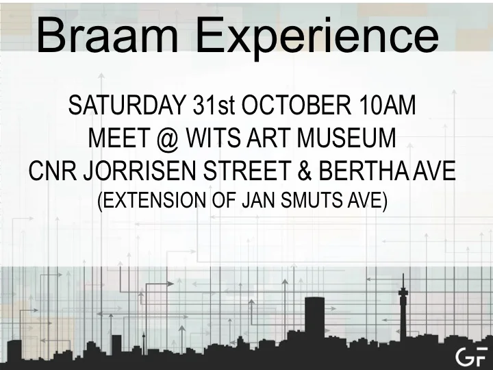 Come and experience Braam with Aphindile and friends Saturday 31st We'll start with coffee at Wits Arts Muesum then walk through a few of the rejuvenated streets of Braam, and end at the Neigbourgoods market for some food. (There will be plenty of opportunity to drink more coffee from the local roasteries on route). After food you will have the chance to walk around some more and pray for the plant.