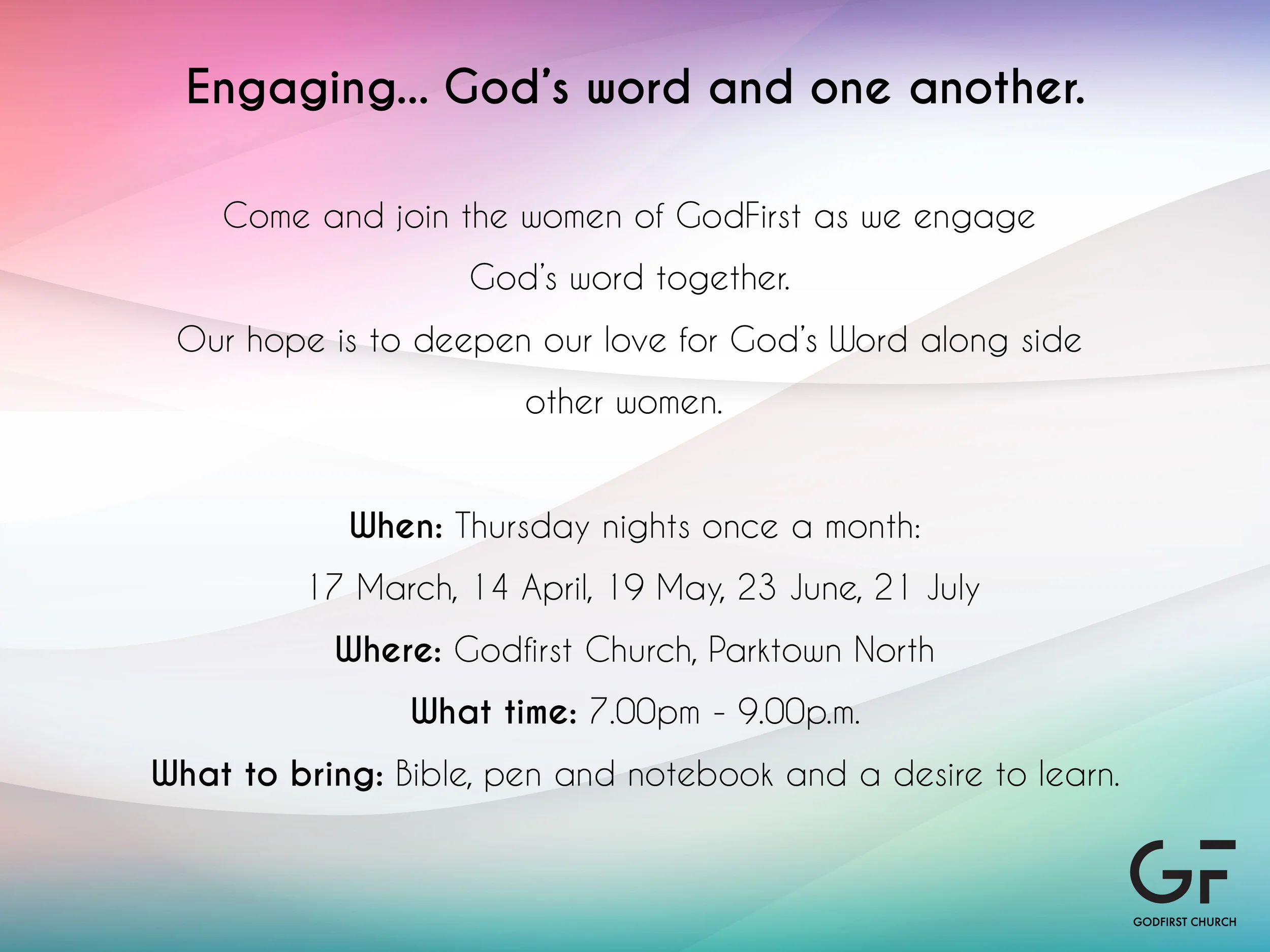 Come and join the ladies of GodFirst as we engage God’s word together.